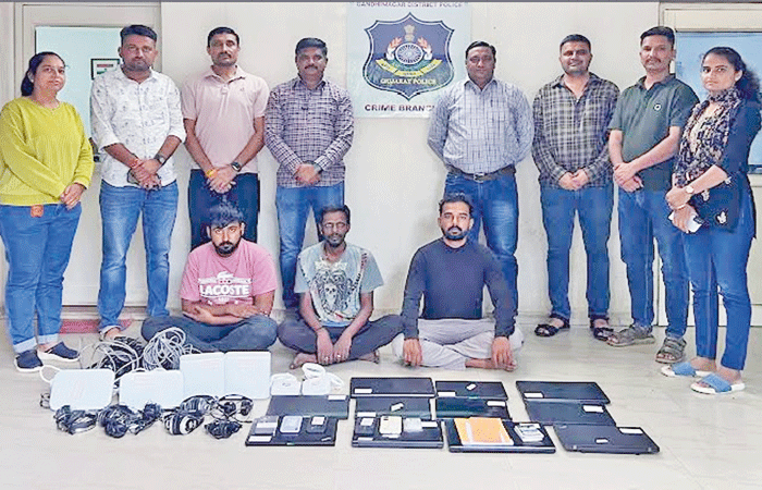 હાલમાં ગેરકાયદેસર કોલ સેન્ટર ચલાવીને ટોળકીઓ દ્વારા દેશ અને વિદેશમાં લોકોને છેતરવામાં આવતા હોય છે ત્યારે રાજ્યમાં વધી રહેલી આ પ્રકારની પ્રવૃત્તિ વચ્ચે ગાંધીનગર રેન્જ ડીઆઈજી અને જિલ્લા પોલીસવડા રવિ તેજા વાસમસેટ્ટી દ્વારા પોલીસને આ દિશામાં કાર્યવાહી કરવા માટે તાકીદ કરવામાં આવી હતી. જેના અનુસંધાને એલસીબી ટુના પોલીસ ઇન્સ્પેક્ટર એચ.પી પરમાર અને તેમની ટીમ ગેરકાયદેસર ચાલતા આ પ્રકારના કોલ સેન્ટરને શોધવા માટે દોડી રહી હતી ત્યારે બાતમી મળી હતી કે, મેદરા ગામની સીમમાં નર્મદા કેનાલ પાસે આવેલા હડકાઈ માતાના મંદિર નજીક એક ફાર્મ હાઉસમાં ગેરકાયદેસર રીતે કોલ સેન્ટર ચાલી રહ્યું છે અને જેમાં વિદેશના નાગરિકોને નિશાન બનાવવામાં આવી રહ્યા છે. જે બાતમીના પગલે પોલીસ ટીમ દ્વારા અહીં દરોડો પાડવામાં આવ્યો હતો. જ્યાં આ ફાર્મ હાઉસમાં ચાર વ્યક્તિઓ હાજર મળી આવ્યા હતા. જેમની પૂછપરછ કરવામાં આવતા તે ઉત્તર પ્રદેશ લાલગંજના આર્યમાનસિંગ પુષ્પેન્દ્રસિંગ સિંગ, મહારાષ્ટ્ર પુણેના પ્રસાદ તાનાજી ભગત,સનોજલાલ ક્લીટુસ લોપઝ અને એન્જેલા અરવિંદ ગાયકવાડ હોવાનું બહાર આવ્યું હતું. પોલીસે અહીં તપાસ કરતા ૧૧ જેટલા લેપટોપ અને પાંચ મોબાઇલ તેમજ અન્ય ઇલેક્ટ્રોનિક ઉપકરણો મળી આવ્યા હતા. જેથી ૨.૧૩ લાખ રૃપિયાનો મુદ્દામાલ કબજે કરીને તપાસ શરૃ કરવામાં આવી હતી.