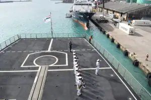 બંદર પર આગમનને સેશેલ્સ સંરક્ષણ દળ (SDF) બેન્ડ દ્વારા ઔપચારિક સ્વાગત સાથે ચિહ્નિત કરવામાં આવ્યું હતું, જે બંને દેશો વચ્ચે મજબૂત દરિયાઈ સંબંધો પર ભાર મૂકે છે. ભારતીય નૌકાદળના ઔપચારિક ગાર્ડ અને બેન્ડનું 1TS પર સમાન એકતા સાથે પરેડ કરવામાં આવી હતી.