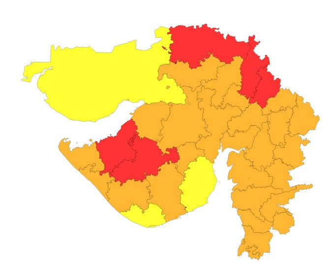 - ઑરેન્જ ઍલર્ટઃ મોરબી, સુરેન્દ્રનગર, પાટણ, બનાસકાંઠા, મહેસાણા, સાબરકાંઠા, ગાંધીનગર, અરવલ્લી, મહીસાગર