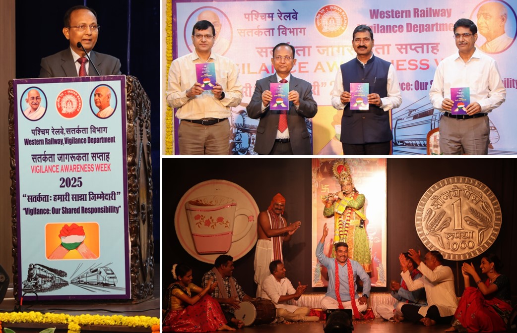 પશ્ચિમ રેલ્વે 27 ઓક્ટોબરથી 2 નવેમ્બર, 2025 દરમિયાન “સતર્કતા: આપણી સહિયારી જવાબદારી” થીમ હેઠળ સતર્કતા જાગૃતિ સપ્તાહ ઉજવી રહ્યું છે. આ જાગૃતિ સપ્તાહનો ઉદ્દેશ જાહેર વહીવટના તમામ ક્ષેત્રોમાં પ્રામાણિકતા, પારદર્શિતા અને જવાબદારીને પ્રોત્સાહન આપવાનો છે, તેમજ ભ્રષ્ટાચારમુક્ત વાતાવરણને પ્રોત્સાહન આપવામાં કર્મચારીઓ અને જનતાની સક્રિય ભાગીદારીને પ્રોત્સાહિત કરવાનો છે. અઠવાડિયા સુધી ચાલતી આ ઉજવણીના ભાગ રૂપે, નૈતિક આચરણ અને સુશાસન વિશે જાગૃતિ ફેલાવવા માટે વિવિધ કાર્યક્રમો અને જનજાગૃતિ પ્રવૃત્તિઓનું આયોજન કરવામાં આવ્યું હતું.